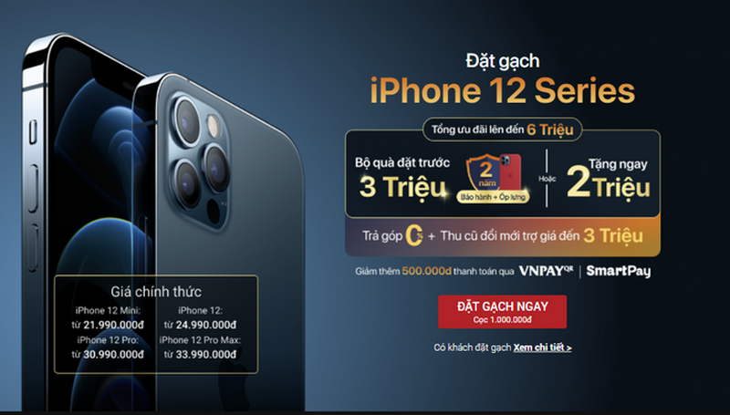Cụ thể: iPhone 12 Mini phiên bản 64GB sẽ có giá bán từ 21,9 triệu đồng, phiên bản 128GB và 256G có giá bán lần lượt là 23,9 triệu đồng và 25,9 triệu đồng. Giá bán có sự thay đổi, tùy thuộc vào màu sắc máy.