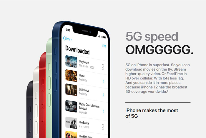 iPhone 12 trở thành chiếc smartphone nhanh nhất và mạnh nhất hiện nay khi trang bị kết nối 5G. Bạn có thể tải nhiều file cùng 1 lúc, xem phim, tải phim, xem video chất lượng cao mà không bị giật lag hay gián đoạn. Hoặc bạn có thể sử dụng Facetime chất lượng cao mà không lo lắng về độ trễ.