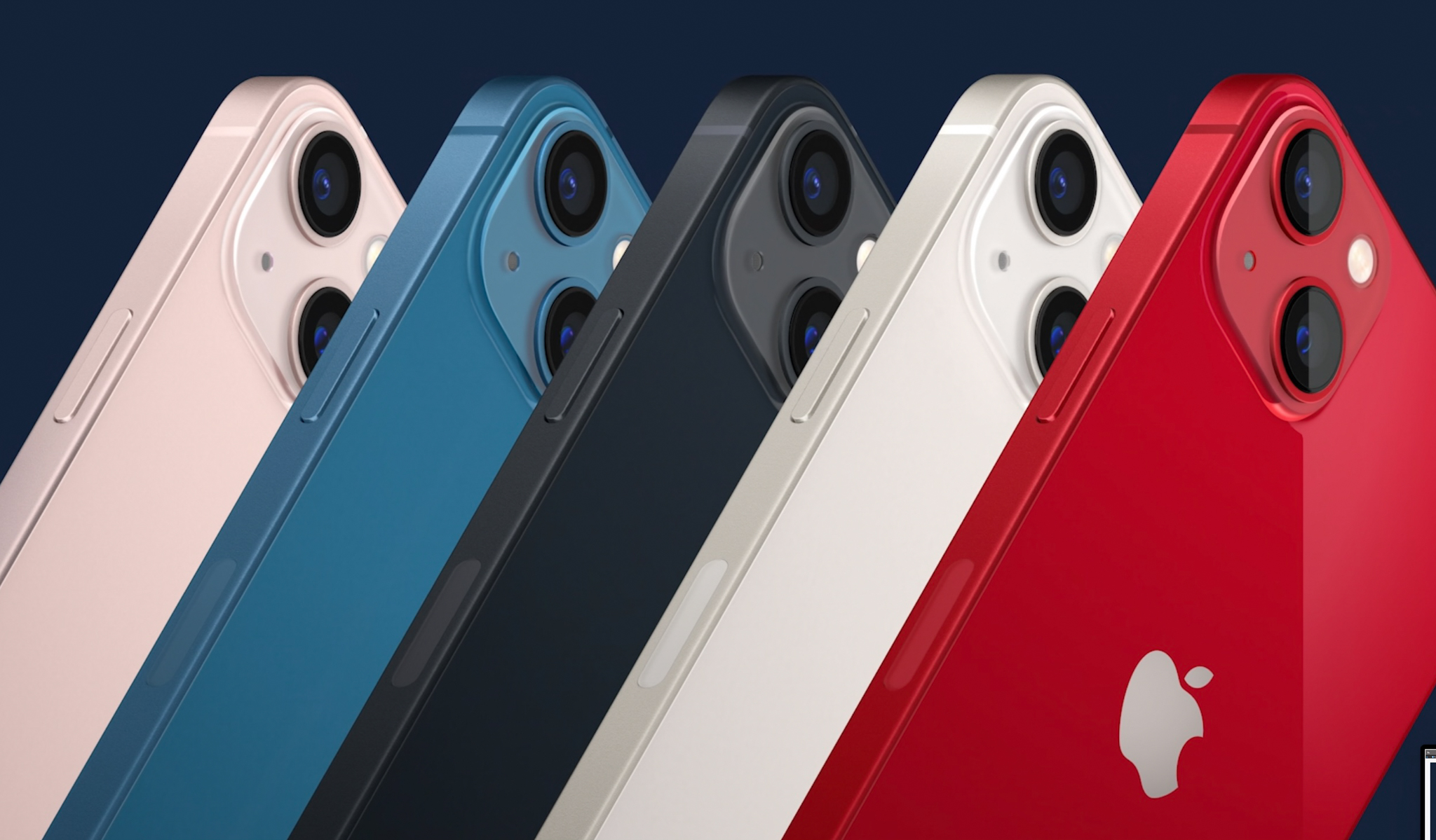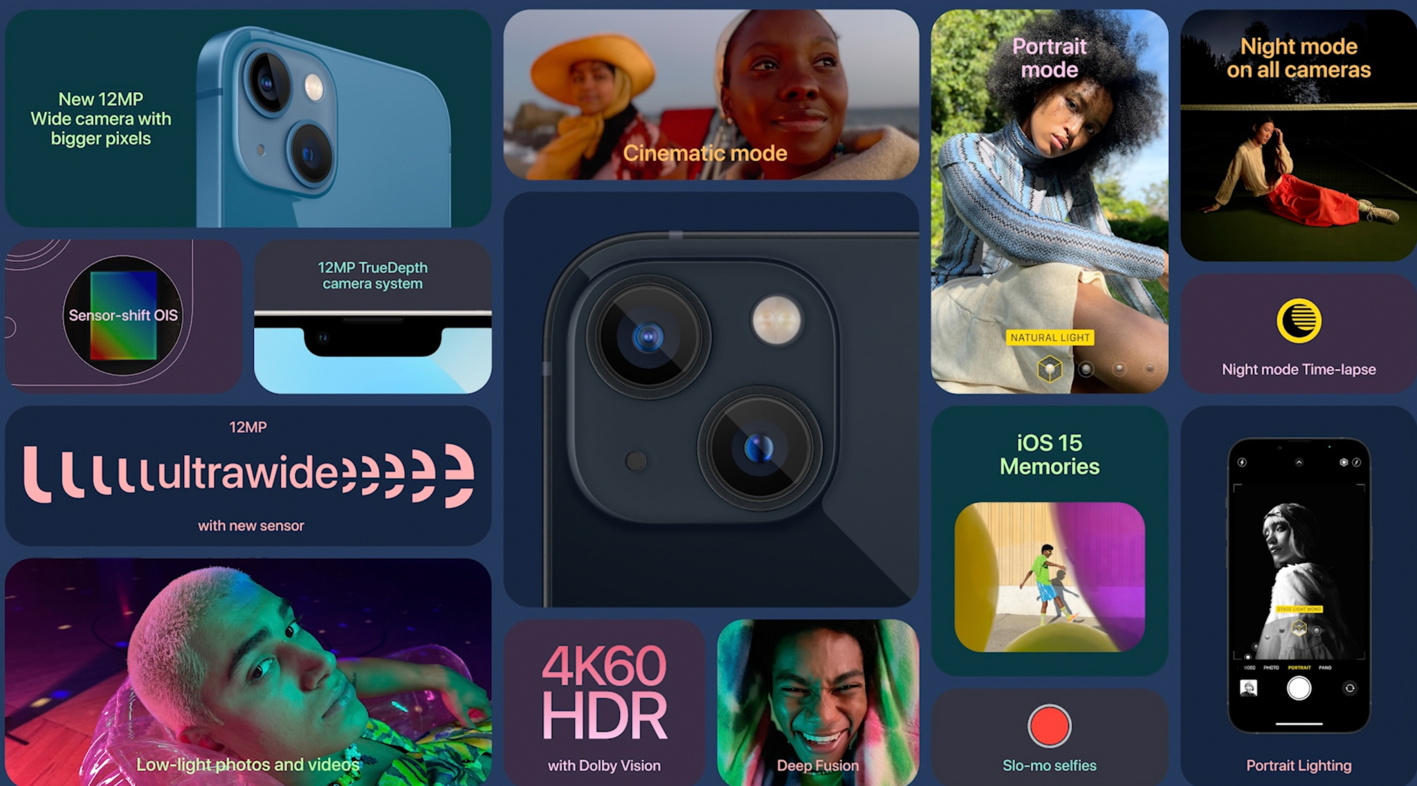 Camera trên iPhone 13 được đặt xéo với camera rộng và góc siêu rộng. Camera chính 12MP f/1.6, cảm biến lớn hơn, thu sáng nhiều hơn 47% cũng như ít noise hơn. Camera còn có thêm tính năng chống rung cảm biến (Sensor-shift OIS) vốn có trên dòng Max của năm ngoái, ảnh chụp và video sẽ được Camera ultrawide có độ phân giải 12MP f/2.4, 13mm, không có chống rung cảm biến.