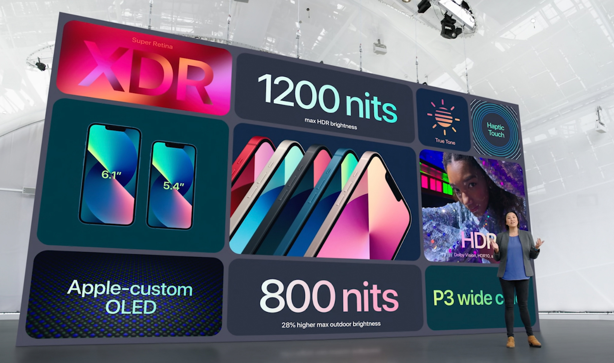 Màn hình iPhone 13 kích thước 6.1 inch sáng hơn 28%, hỗ trợ nội dụng dung HDR, độ sáng khi sử dụng ngoài trời sẽ là 800 nits và đạt peak lên đến 1200 nits. Đây vẫn là màn hình OLED, hỗ trợ dải màu rộng, Apple cho rằng hình ảnh trên iPhone 13 Mini cho cảm giác chân thực nhất, màu sắc chính xác nhất. Hỗ trợ công nghệ Super Renita XDR với mật độ điểm ảnh cao, cho hình ảnh luôn sắc nét. Điểm thay đổi lớn nhất khi tai thỏ rộng hơn (notch nhỏ hơn) giúp người dùng có thêm thông tin khi xem trên màn hình iPhone 13.