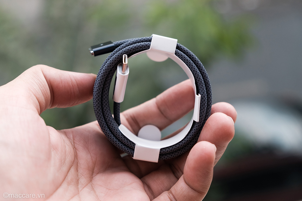 Dây sạc magsafe 3 trong trường hợp có ai đó vấp phải dây cáp, nó sẽ nhả ra để máy tính vẫn được cố định, không bị kéo theo dẫn tới tình trạng rơi rớt hay va đập. Đèn LED trên đầu kết nối chuyển sang màu hổ phách khi pin đang sạc và khi được sạc đầy, nó chuyển sang màu xanh lục. Sản phẩm được thiết kế vải bện xung quanh, cho độ bền lâu dài.