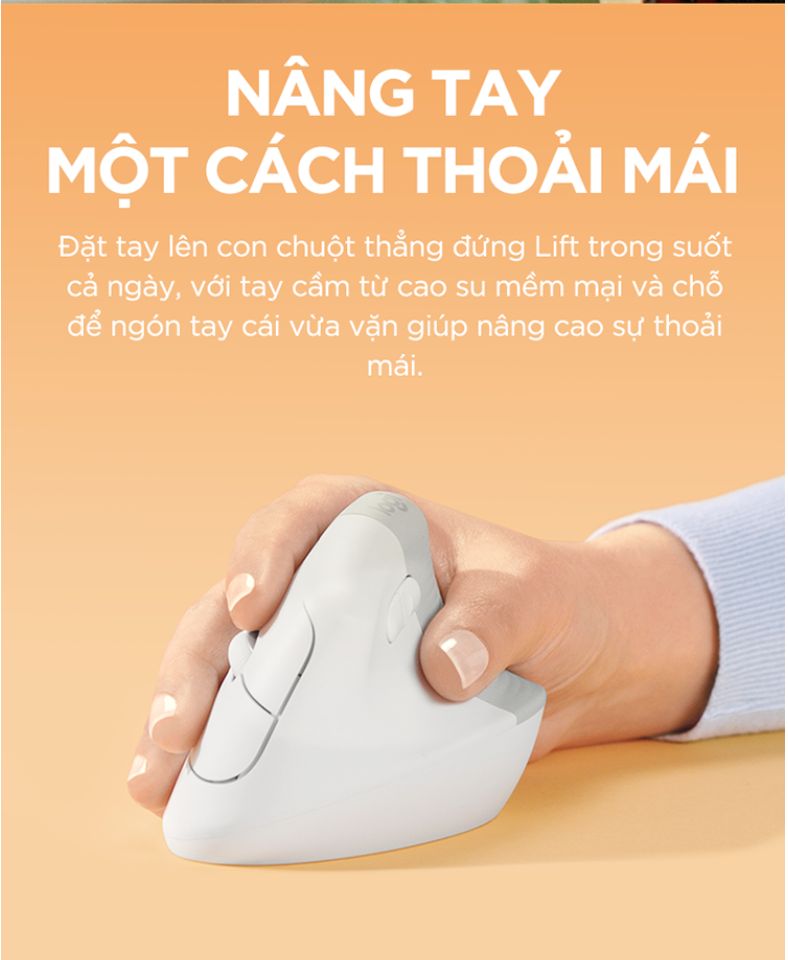 Đặt tay lên con chuột thẳng đứng Lift trong suốt cả ngày, với tay cầm hoa văn mềm mại và chỗ để ngón tay cái vừa vặn giúp nâng cao sự thoải mái.