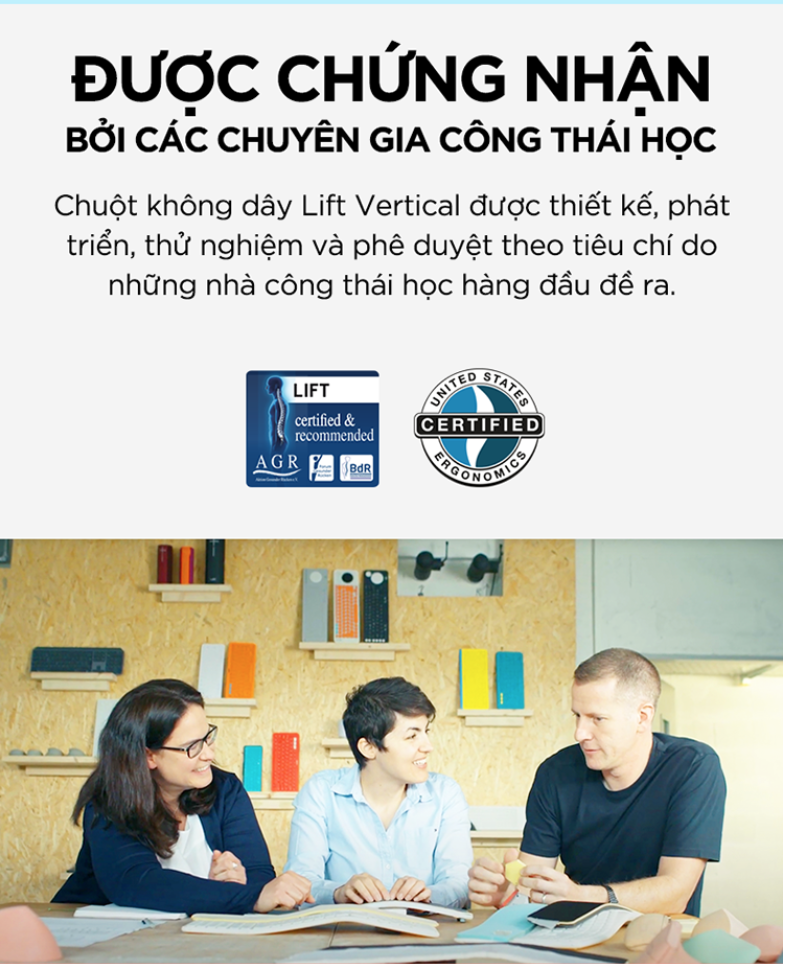 Chuột không dây Lift Vertical được thiết kế, phát triển, thử nghiệm và phê duyệt theo tiêu chí do những nhà công thái học hàng đầu đề ra.