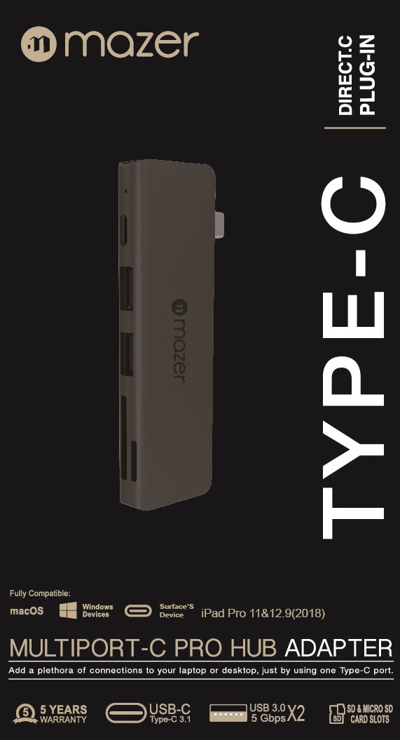 - Sản phẩm cổng chuyển đổi Mazer USB-C Direct Plug-in 5 in 1 có bộ “áo giáp” được làm từ chất liệu Aluminum. Chất liệu này có thể hạn chế và giảm tối đa tình trạng nhiễu điện từ.