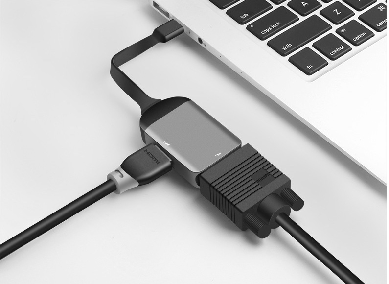 Thiết bị bao gồm cổng Type C kết hợp với 2 đầu chuyển đổi HDMI và VGA. Vì sao nói thiết bị này là cần thiết trong công việc và giải trí. Vì thông thường cổng Type C thường được sản xuất với các thiết bị nhỏ gọn như điện thoại, nên việc truyền tải hình ảnh, video sang màn hình lớn hơn thường sẽ gặp khó khăn.