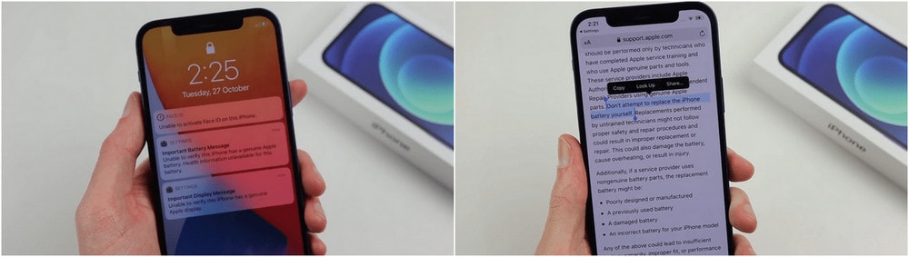 Ngay sau khi thiết bị được khởi động, trên màn hình thiết bị sẽ đưa ra các thông báo về pin, màn hinh, đồng thời Face ID cũng không thế hoạt động được. Cùng với đó Apple cũng đưa ra các khuyến cáo người dùng không được tự ý thay pin trên iPhone 12, nhanh chóng đem điện thoại của mình đến các cửa hàng được Apple ủy quyền để được hỗ trợ.