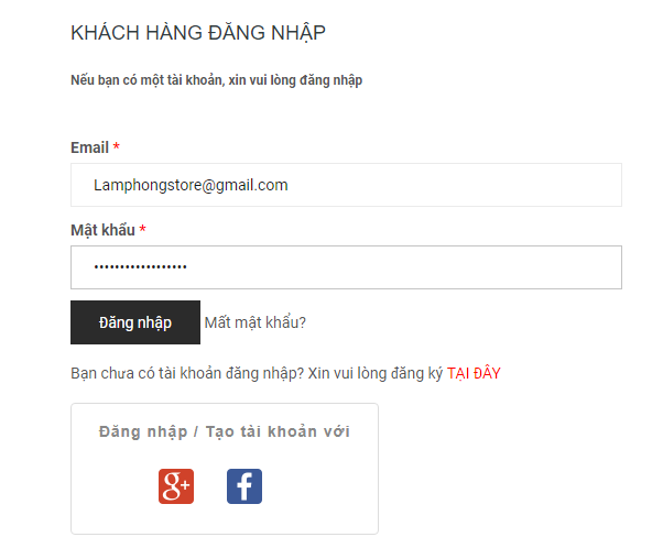 Như hình bên trên bạn điền đầy đủ thông tin yêu cầu. Ngoài ra khách hàng còn có thể đăng ký dựa trên tài khoản Facebook cá nhân, rất nhanh chóng và thuận tiện để sở hữu một tài khoản mua hàng trên Lâm Phong Store.