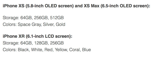 iPhone XR là model rẻ nhất với các phiên bản dung lượng 64, 128, 256 GB với 6 màu sắc. Trong khi đó, 2 model cao cấp sẽ có các bản 64, 256 và 512 GB. Nếu đúng, đây sẽ là lần đầu tiên iPhone có bản dung lượng 512 GB, ngang bằng với Galaxy Note 9 của Samsung.