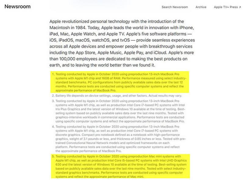 Theo PCworld, có khả năng Apple đang so sánh chip M1 với các vi xử lý Itel từ Atom, Celeron N hoặc Core i3 trở lên, các dòng chip có đồ họa tích hợp. Với cách tiếp thị không giải thích rõ từ "hiệu suất", Apple đang mập mờ trong cách giới thiệu sản phẩm của mình. Liệu có sự công bằng nào giữa việc so sánh hiệu suất giữa một chiếc Macbook giá 999 USD với một chiếc laptop giá chỉ 150 USD. Bởi lẽ những chiếc laptop trị giá 150 USD này cũng nằm trong 98% trong những máy tính được bán ra trong năm nay với một tỷ lệ không nhỏ.