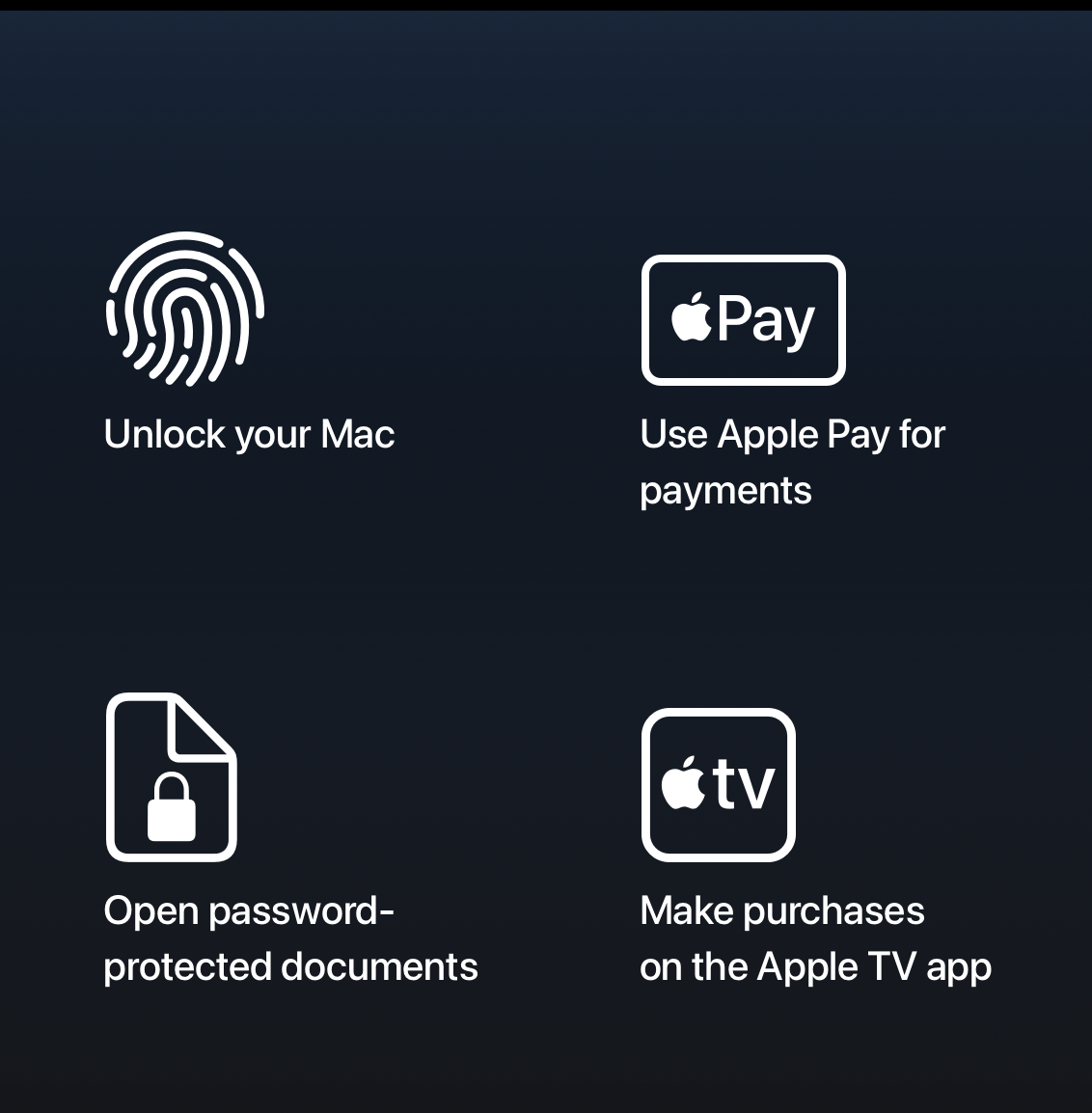 Một lần chạm vào cảm biến sẽ mở khóa máy Mac của bạn ngay lập tức và một lần nhấn sẽ khóa máy. Sử dụng vân tay của bạn để thuê phim, mua ứng dụng hoặc truy cập vào những thứ như tài liệu bị khóa hoặc cài đặt hệ thống mà không cần phải nhập lại mật khẩu của bạn. Và khi bạn mua sắm trực tuyến bằng Apple Pay, Touch ID sẽ tự động điền vào thông tin giao hàng và thanh toán của bạn mà không cần chia sẻ chi tiết thẻ của bạn.