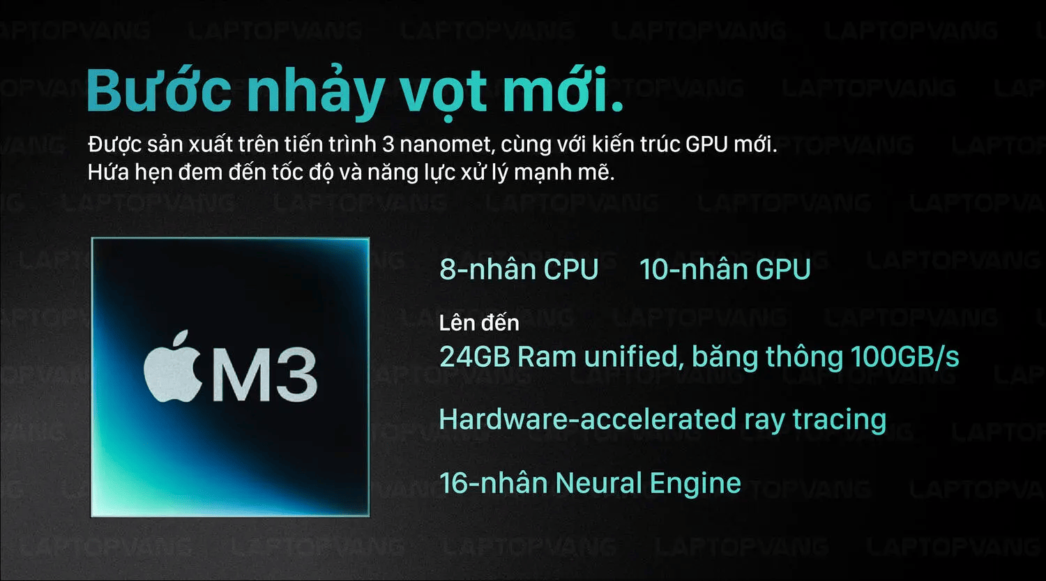 Với công nghệ mới gọi là Dynamic Caching, cho phép GPU chỉ sử dụng lượng bộ nhớ cục bộ cần thiết cho mỗi tác vụ. giúp giảm lượng điện năng tiêu thụ. Kết quả là, để GPU của M3 đạt hiệu năng như chip M1. Thì chỉ cần dùng một nửa lượng điện năng.
