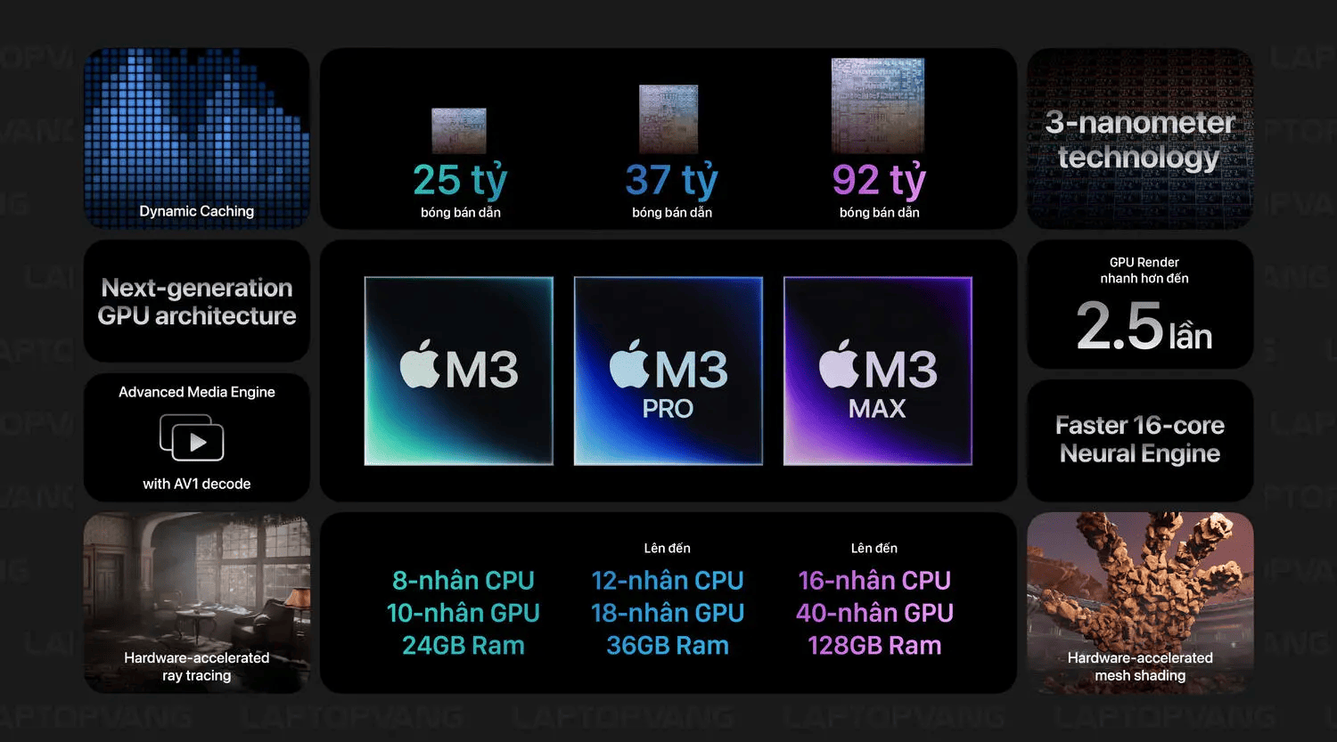 Thay đổi đáng chú ý nhất của dòng chip M3 là cấu trúc GPU được trang bị công nghệ mới: Dynamic Caching, Mesh Shading, Ray Tracing. Và cả ba tính năng này đều là nhờ sự hỗ trợ đến từ phấn cứng.