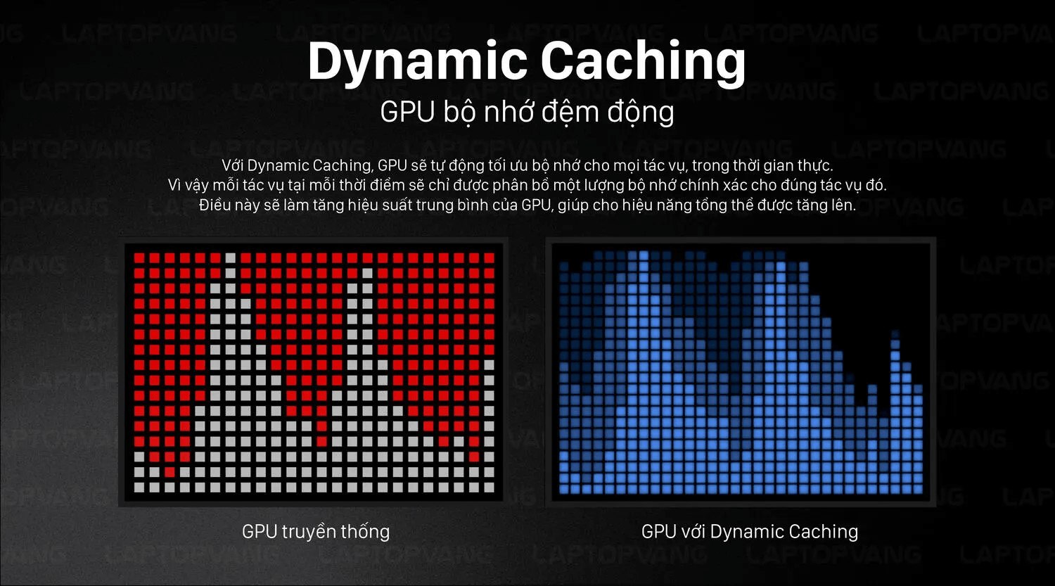 Dynamic Caching trình là công nghệ giúp tối ưu bộ nhớ cần sử dụng. Bộ nhớ cục bộ trong phần cứng trong thời gian thực để chỉ sử dụng lượng bộ nhớ chính xác cần thiết cho mỗi tác vụ. Nhờ vậy mà chip M3 chỉ cần một nửa năng lượng để đạt hiệu năng tương tự với M1.