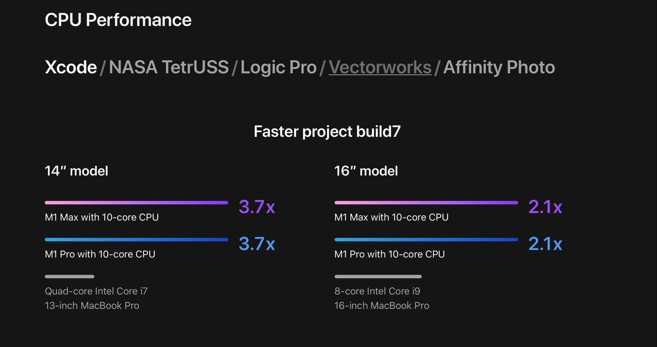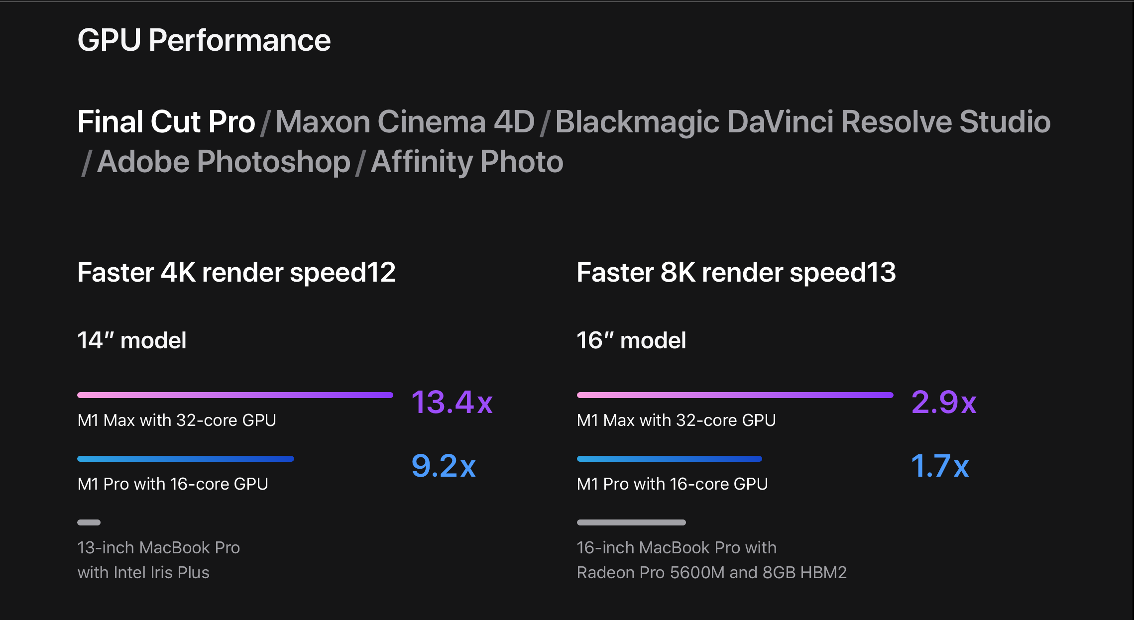 Chip M1 Max cung cấp cùng một CPU 10 lõi, có GPU 32 lõi và gấp đôi băng thông bộ nhớ của M1 Max. Nó cũng cung cấp 2 công cụ mã hóa video và 2 công cụ mã hóa / giải mã ProRes.