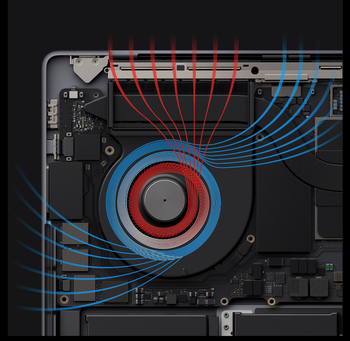 Phần thú vị nhất. Hệ thống nhiệt tiên tiến di chuyển không khí nhiều hơn 50%, ngay cả ở tốc độ quạt thấp hơn. Và nhờ hiệu quả của silicon Apple, quạt không bao giờ bật cho nhiều tác vụ bạn làm hàng ngày.