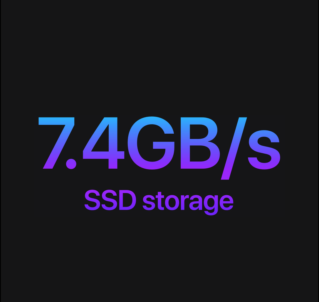 Nhanh và rộng lớn. Nhận tốc độ đọc đáng kinh ngạc từ SSD lên đến 8TB - lên đến 7,4GB / s23 hoặc gấp hai lần thế hệ trước. 24 Vì vậy, bạn có thể mở video 8K ngay lập tức hoặc lưu trữ hàng trăm nghìn ảnh RAW cùng một lúc.