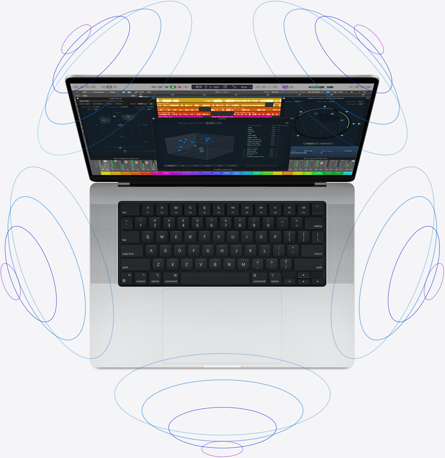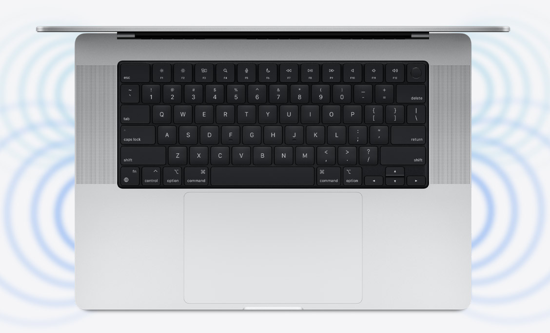 Âm thanh không gian. Nhờ hệ thống sáu loa lấp đầy phòng và các thuật toán tiên tiến, MacBook Pro hỗ trợ âm thanh không gian khi phát nhạc hoặc video với Dolby Atmos, tạo ra âm trường ba chiều tinh vi. Kết hợp điều đó với màn hình Liquid Retina XDR và nó giống như có một rạp hát di động.