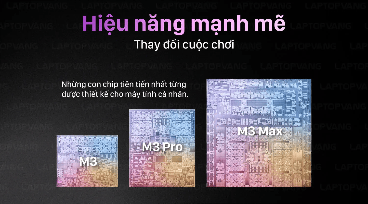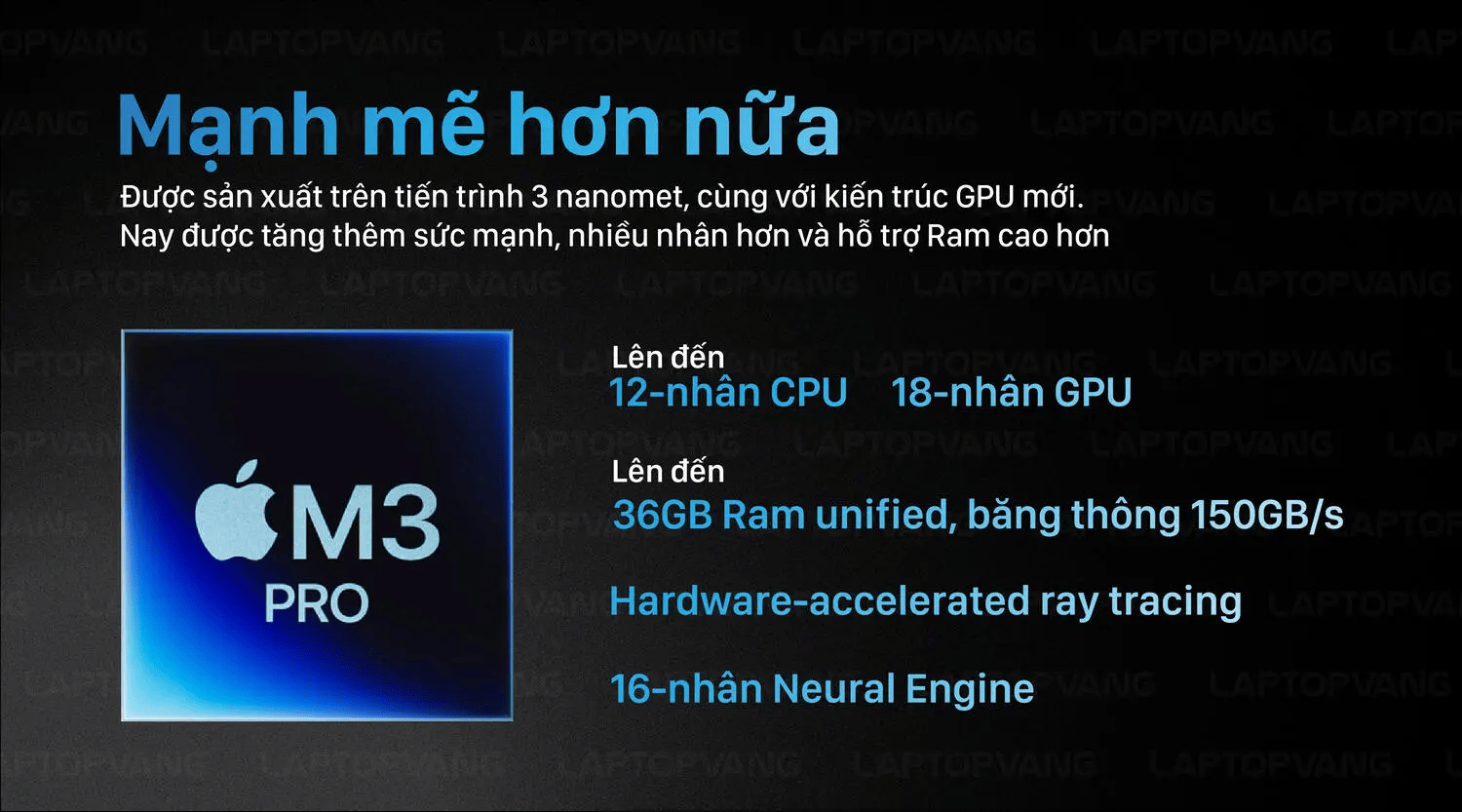 Tiến trình 3nm giúp Apple có thể tích hợp nhiều bóng bán dẫn hơn vào chip M3 Pro. Với 37 tỷ bóng bán dẫn và 18 nhân GPU hiệu năng đồ họa của chip M3 Pro là một bước nhảy vọt so với các thế hệ chip trước của Apple.