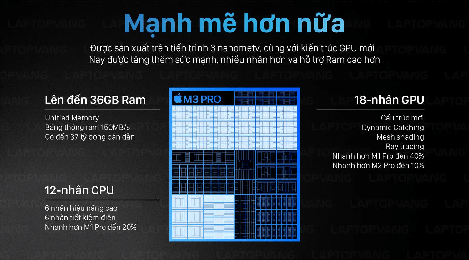 So với chip M1 Pro, M3 Pro có tốc độ nhanh hơn 40%. Điều này có nghĩa là M3 Pro có thể xử lý các tác vụ đồ họa nặng nhanh hơn 40% so với M1 Pro.
