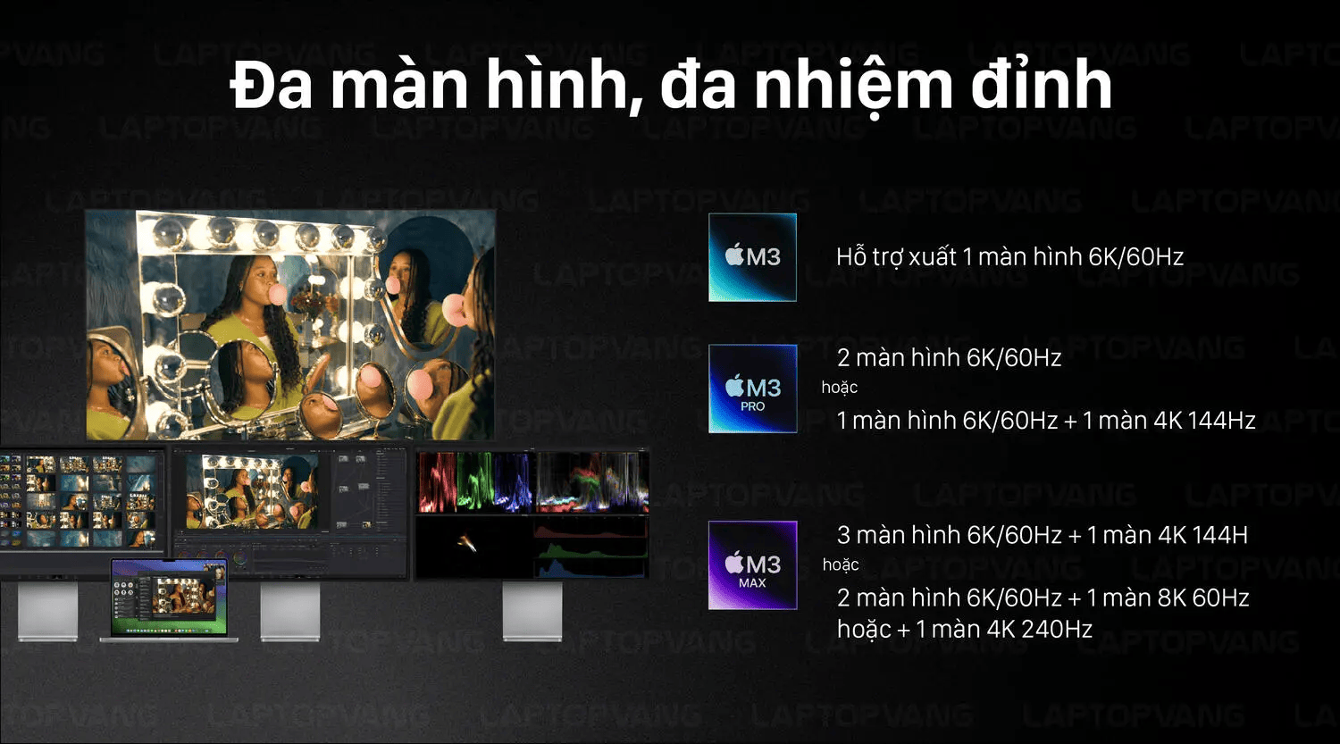 Ví dụ, M3 Pro có thể chạy các game AAA ở độ phân giải 4K với tốc độ khung hình cao hơn. M3 Pro cũng có thể xử lý các tác vụ dựng phim 4K và 8K nhanh hơn đáng kể so với M1 Pro.