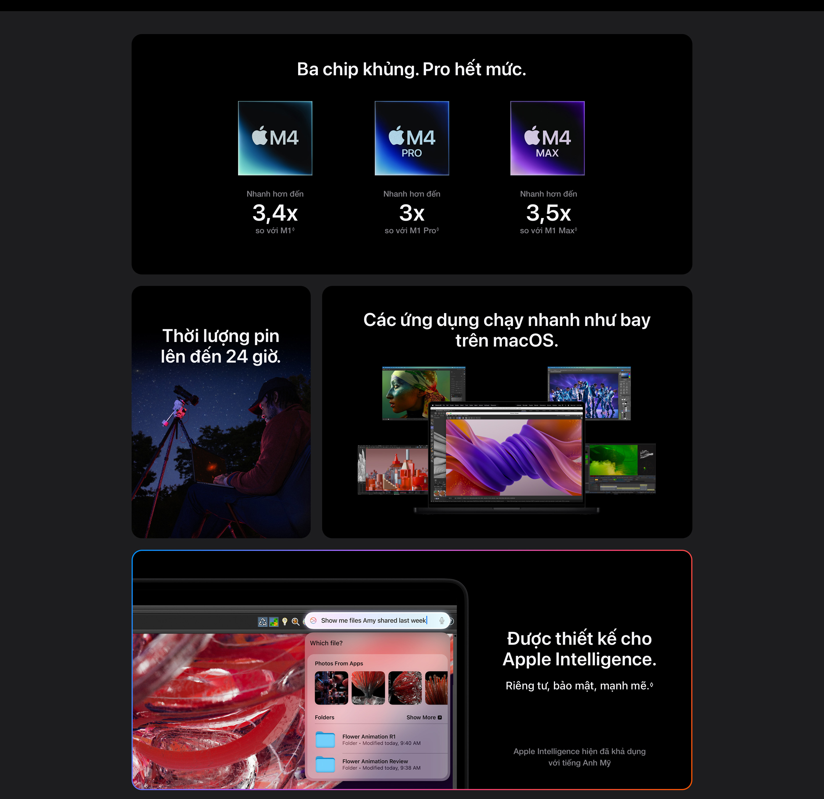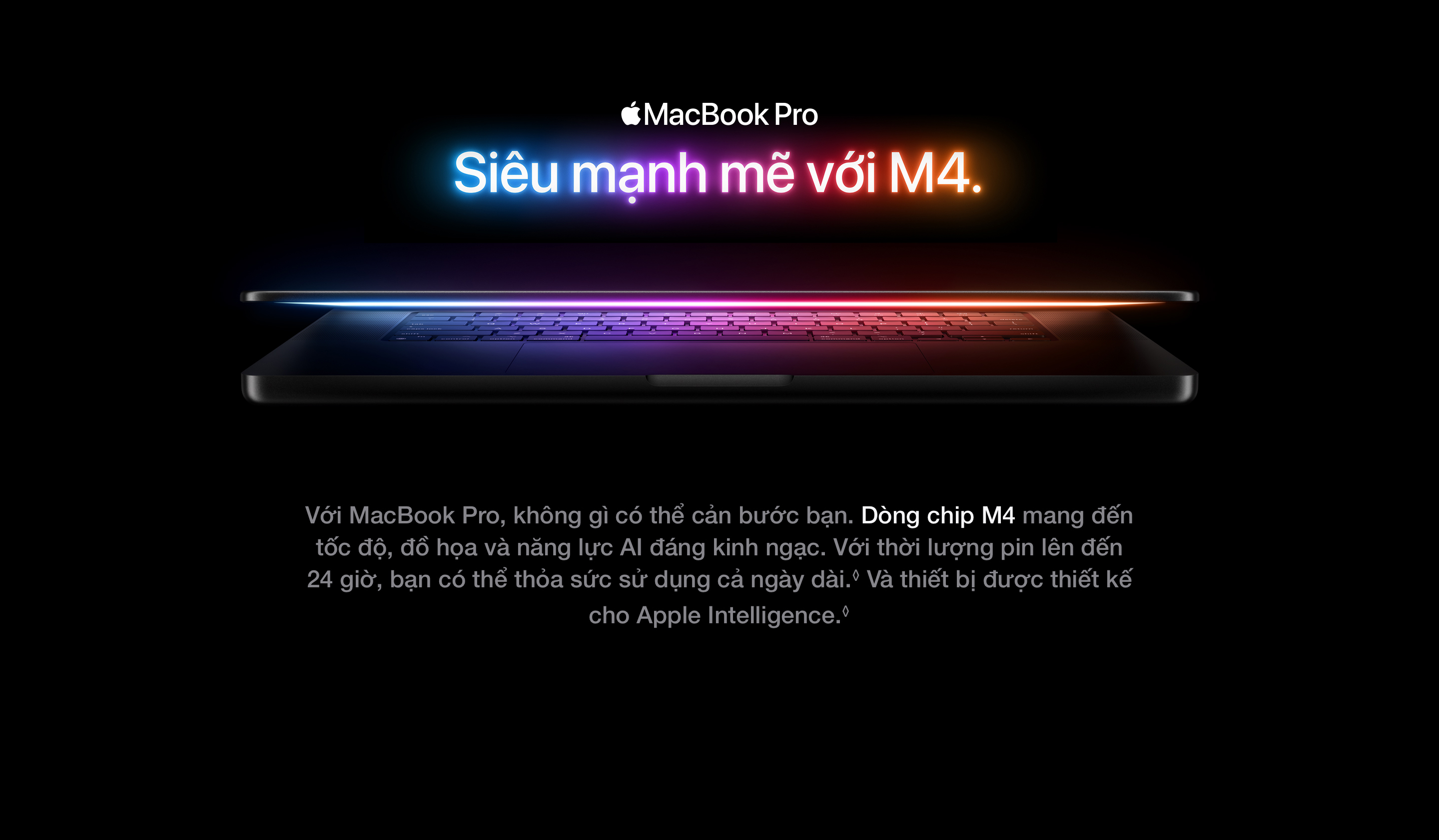 - Cấu hình: Apple M4 Pro Chip, 14-core CPU, 20-core GPU, 16-core Neural Engine, 48GB RAM, 512GB SSD