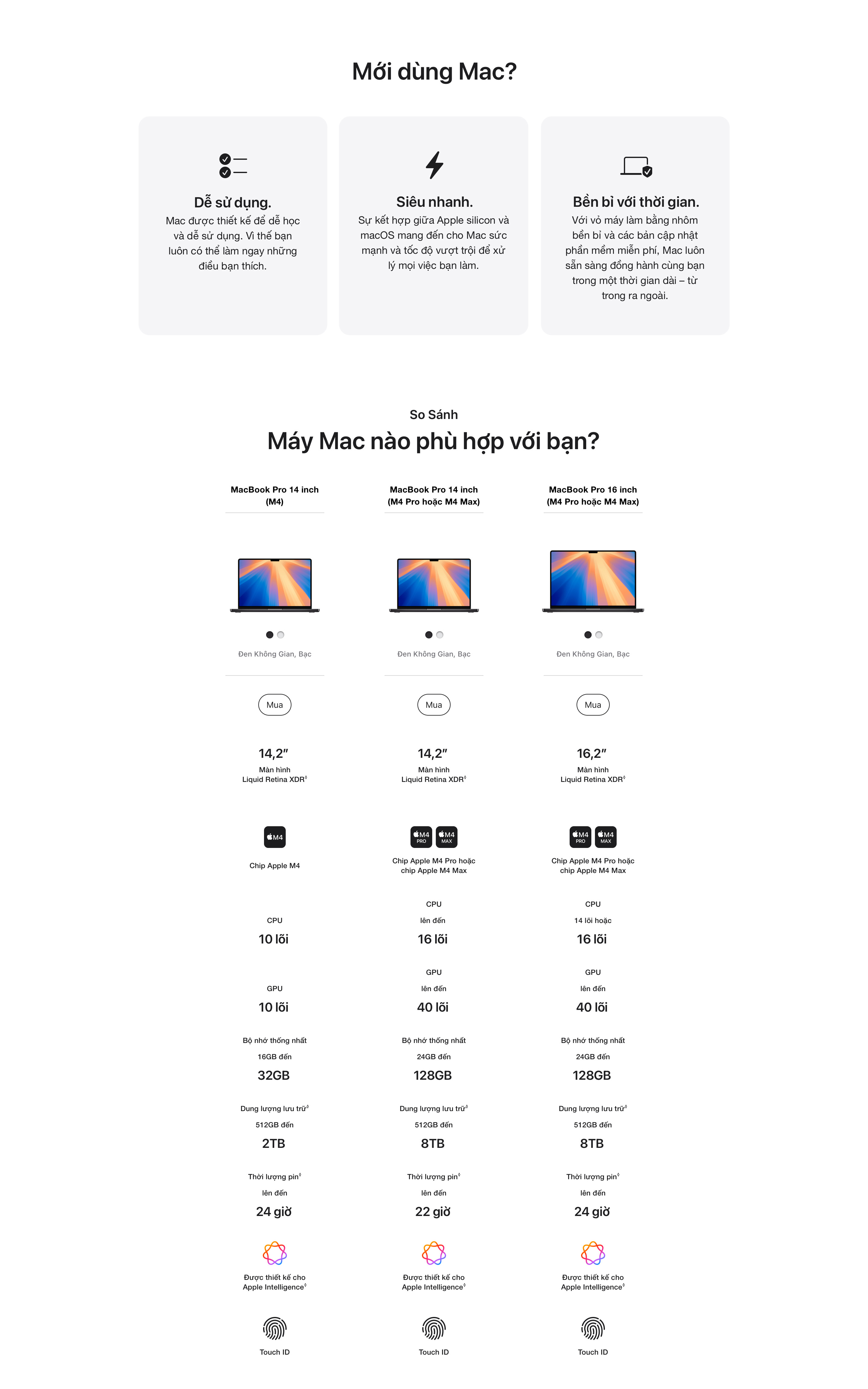 Loại CPU: Apple M4 Max 14 lõi với 10 lõi hiệu năng và 4 lõi tiết kiệm điện