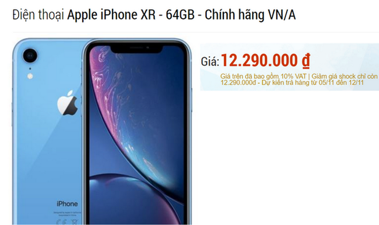 Đầu tháng 11 vừa qua, nhiều đại lý đã mở lại hệ thống cho phép đặt hàng iPhone XR mã VN/A với phiên bản hộp mới (không kèm củ sạc và tai nghe) với mức giá giảm từ 3 đến 4 triệu đồng so với mức giá hồi tháng 9. iPhone XR có mức giá bán dao động khoảng 12 triệu đồng.