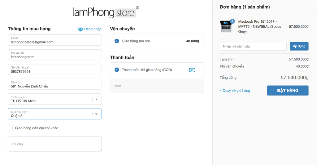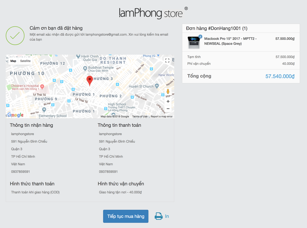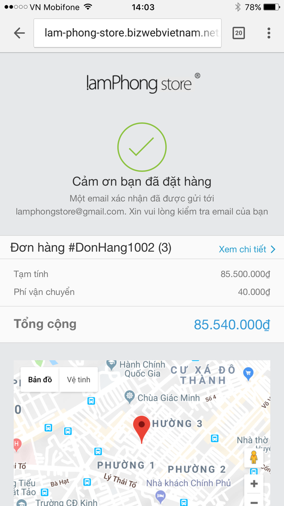 Bạn đã hoàn tất việc đặt hàng và có mã số đơn hàng. Lamphongstore sẽ liên lạc với bạn để xác nhận đơn hàng trước khi tiến hành giao.